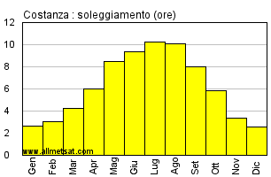 | Media mensile del numero di ore di sole per giorno. |