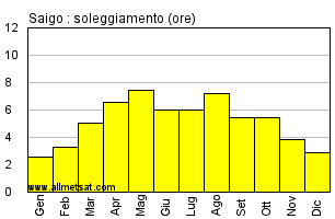 | Media mensile del numero di ore di sole per giorno. |