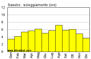| Media mensile del numero di ore di sole per giorno. |